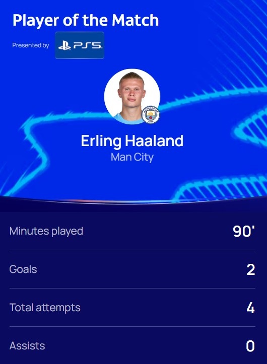 梅开二度!官方:哈兰德当选曼城2-2摩纳哥全场最佳球员